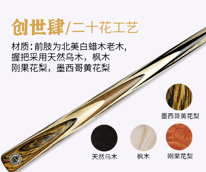握把采用天然乌木,枫木,墨西哥黄花梨为原料,天然木质,精美剑纹,优质职业杆头坚韧耐用,给力更直接